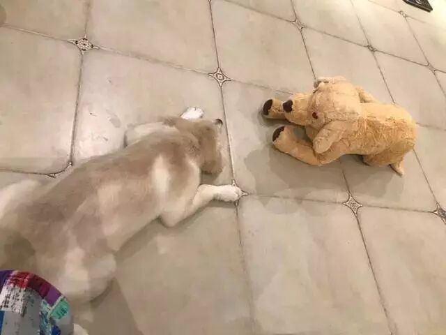 主人给狗狗买了一只大狗狗玩偶,怀着小小的期待拿回家希望狗狗会喜欢,一开始的画风还是比较正常的,狗子愿意跟玩偶玩。