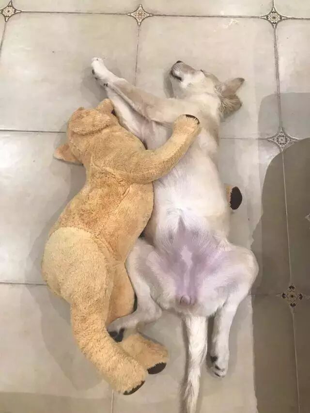 玩了一会累了,狗狗就跟玩偶一起睡觉,但是......