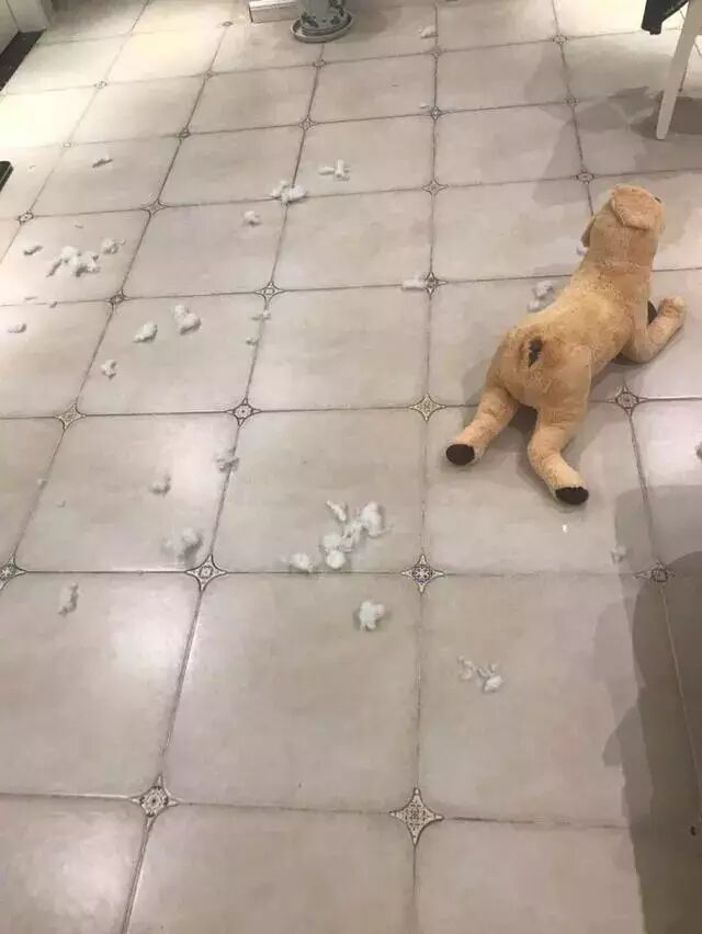 结果主人睡了个午觉,起来就发现一地的毛绒玩具填充物,内心犯嘀咕:狗子这是又作什么妖了?!