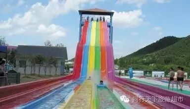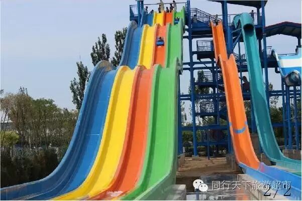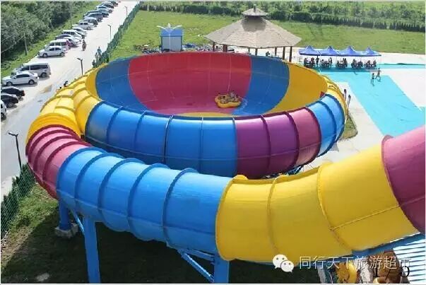 三色组合滑道,远看就像三条舞动的“飘带”,或与家人,或与朋友从塔端开始伴随着尖叫声沿着交错的“飘带”旋转冲刺,一起水中“飞舞”。