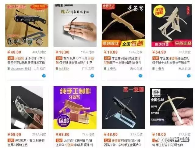 在某宝上搜索“”,会出现一行提示:据相关法律法规和政策,无法显示“”的相关宝贝。但如果你搜索“牙签”,就会跳出很多商品,卖得最火的就是这种全金属制成的“牙签”。店家在商品说明中是这么写的:小只是玩具,不能打鸟不能打野猪。适用年龄: 5岁。