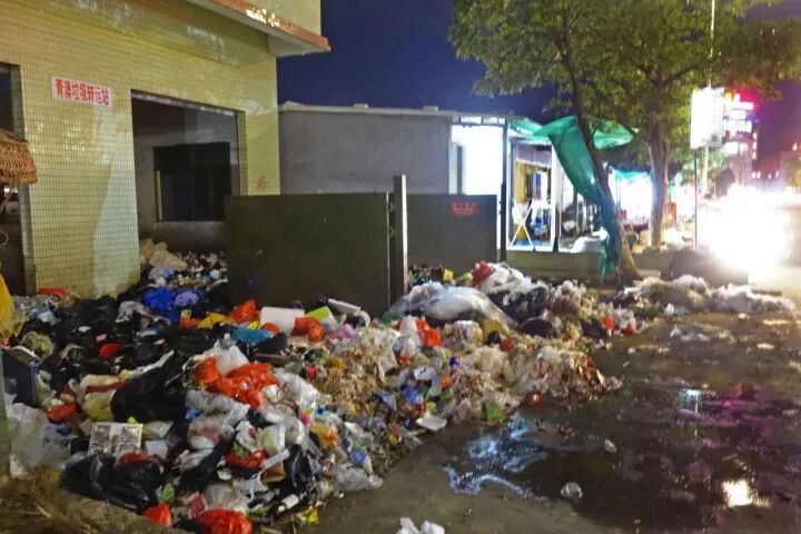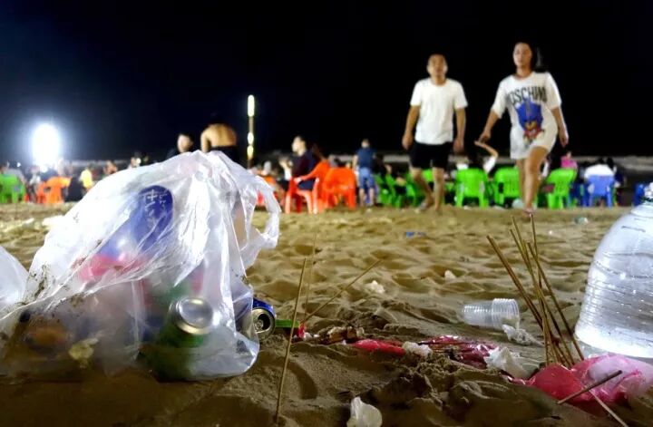 在这熙熙攘攘的“沙滩夜市”里,记者看到,沙滩上布满了各式各样的垃圾。饮料瓶、快餐盒、竹签、纸巾,甚至是吃了一半就被丢弃了的食物……在离海水近的地方,垃圾被海水拖着上上下下,有的往海里飘,有的又被卷上沙滩。