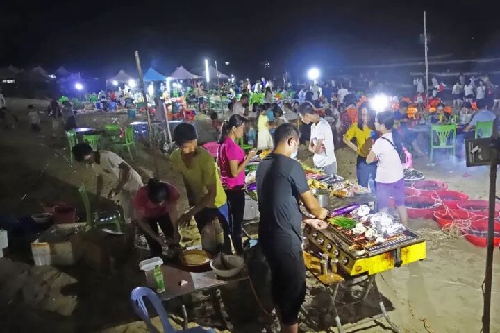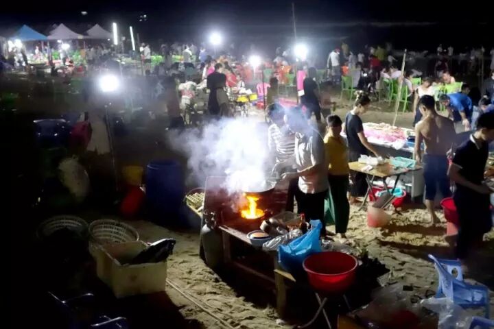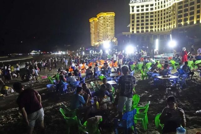 这样的“火爆”场面直至凌晨还未“降温”。烧烤摊的摊主告诉记者,他们天一黑就摆摊营业,一般都忙到凌晨1、2点,“但如果还有客人来,开到几点都行!”摊主得意地说:“一放假游客特别多,生意特别好。”在浓重的夜色下,在呛人的气味里,在随处可见的垃圾中,这个有着“东方夏威夷”之称的海湾,秀美的气质已是荡然无存。