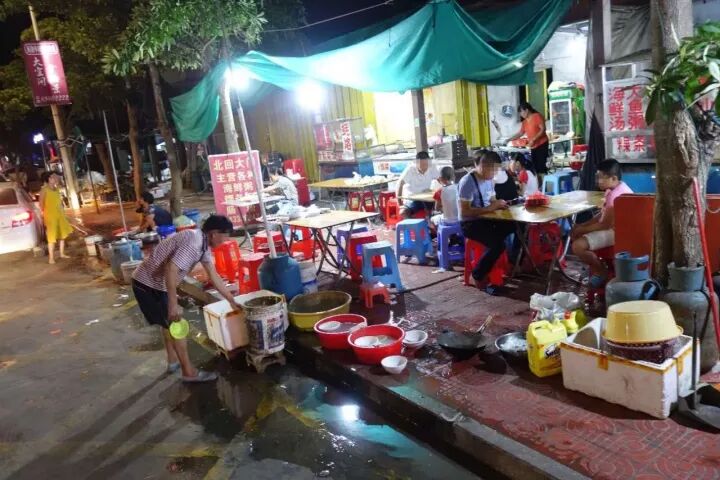 垃圾站两边是数家饮食店,有经营海鲜大排档的,也有经营潮汕小吃的。晚上10点多了,仍有不少食客在用餐。大部分餐饮店把桌椅摆在了步道上,工作人员则蹲在路边清洗餐具,污水也直接倒在了路边,影响了环境卫生也影响了人们通行。