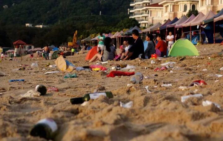6日清晨6点半,记者再次来到青澳湾,朝阳下的海面熠熠生辉,游客们踩着海水嬉戏,看着十分惬意。然而,经受一夜“蹂躏”的沙滩让人不忍直视。坑坑洼洼的沙滩上到处是垃圾,清洁工人忙着清扫。一位清洁工告诉记者,他们几名清洁工在沙滩上分工分段清扫,每天早上和下午分别清扫一次。仅他负责的这一段,每天早上就能清扫出五六筐垃圾,“怎么扫都扫不完,垃圾太多了!”