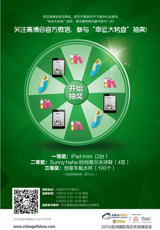 幸运大转盘,转出你的好运气!实用的Ipad, 穿出时尚的高尔夫球鞋,还有中奖率超高的创意车载水杯,等同白送!