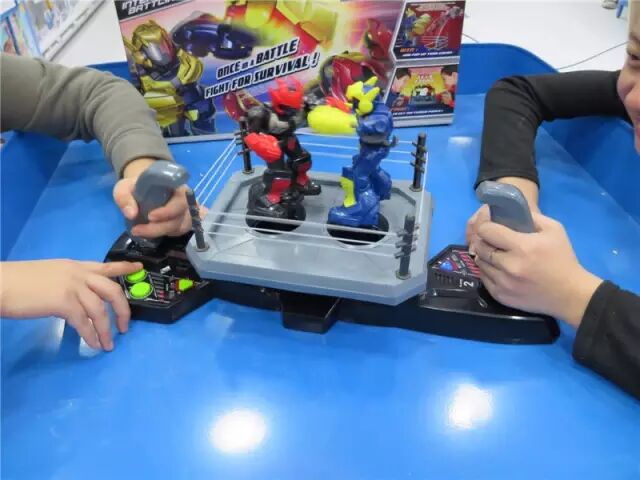 ▲ 男孩可以和小伙伴试玩这款格斗机器人,用手柄和按键操作,机器人在擂台上一争高下。售价299元。