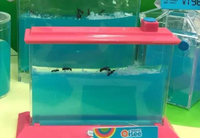▲ 喜欢动物的,可以选择蚂蚁工坊,蓝色的物质是“仿土”,可以清楚观察到蚂蚁打洞的路径,了解蚂蚁的生活习性。“仿土”里含有营养液,足以保证蚂蚁的存货。一旦不小心蚂蚁死掉了,还是可以回店里重新领取的,免费。这款玩具按照工坊造型不同,98元到228元价格不等,随工坊一次可以赠送7-8只蚂蚁。