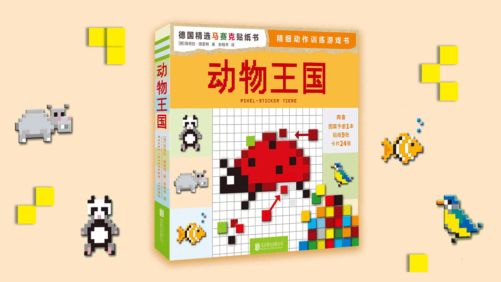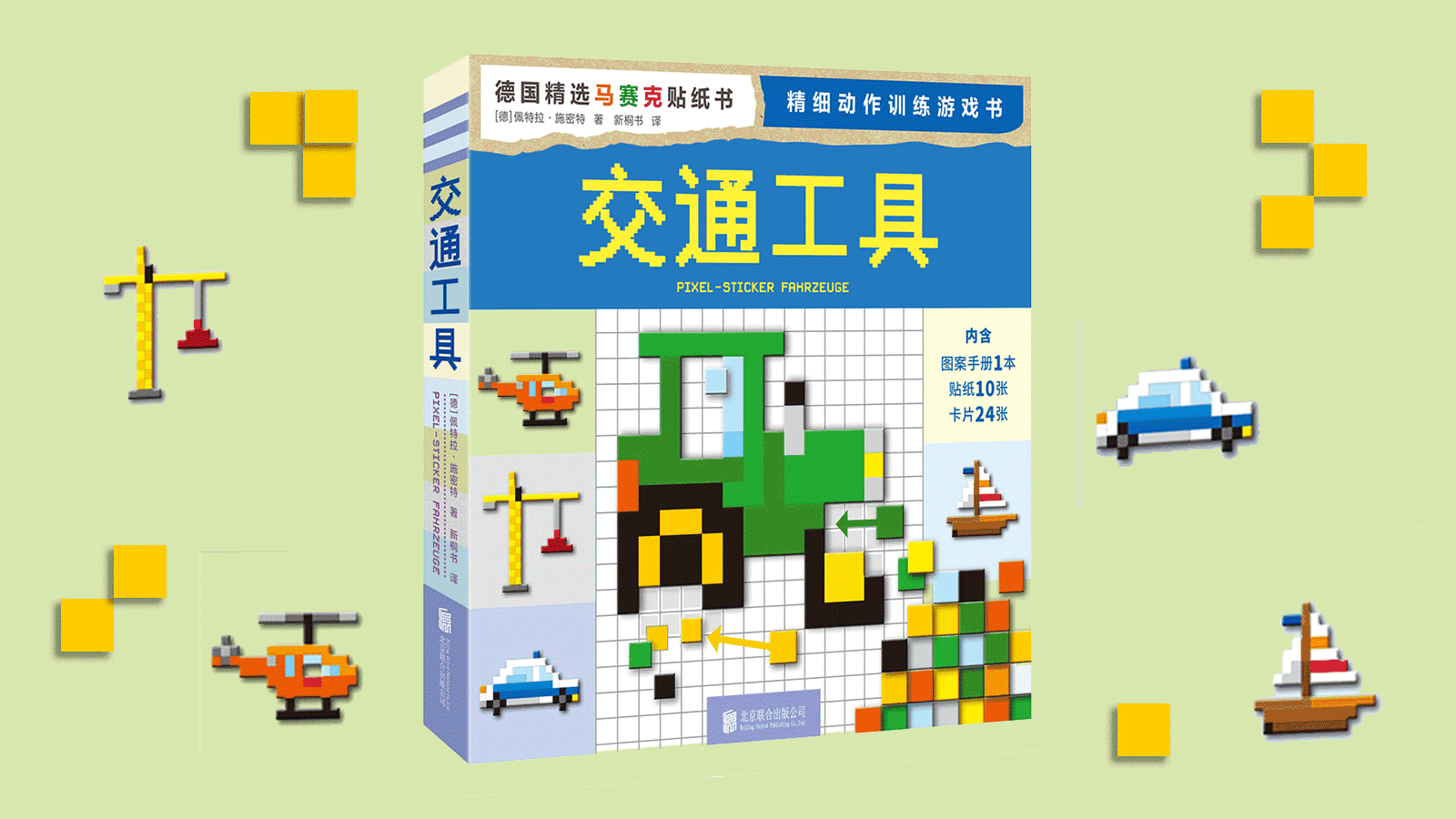 书的设计将像素画艺术与贴纸游戏完美结合,几个色块相互拼接,就可以拼成一架小飞机,一辆小汽车,一匹独角兽,一只七星瓢虫。外包装采用盒装设计,内含1本图案手册(有23种像素画图案供参考)、10张贴纸和24张卡片,既方便孩子操作,又方便收纳。