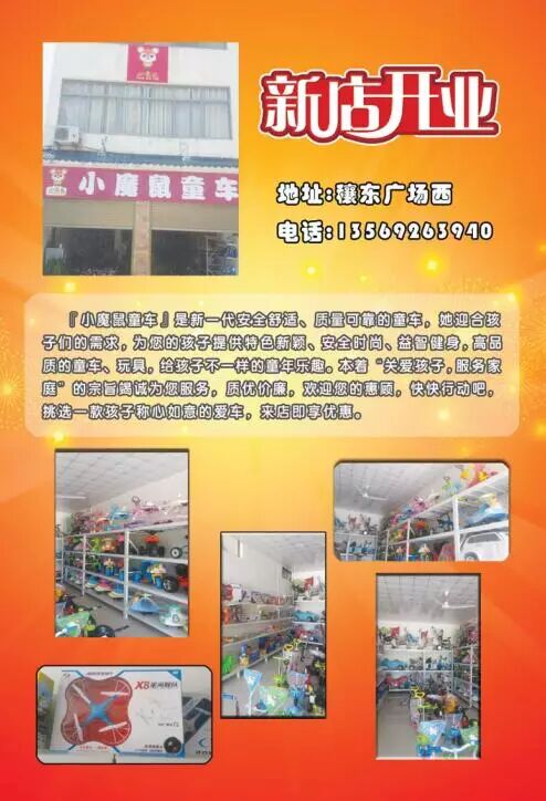 『小魔鼠童车』位于穰东镇老派出所前广场的西侧,是新开的一家品种齐全、时尚新颖、质量可靠的童车专营店。