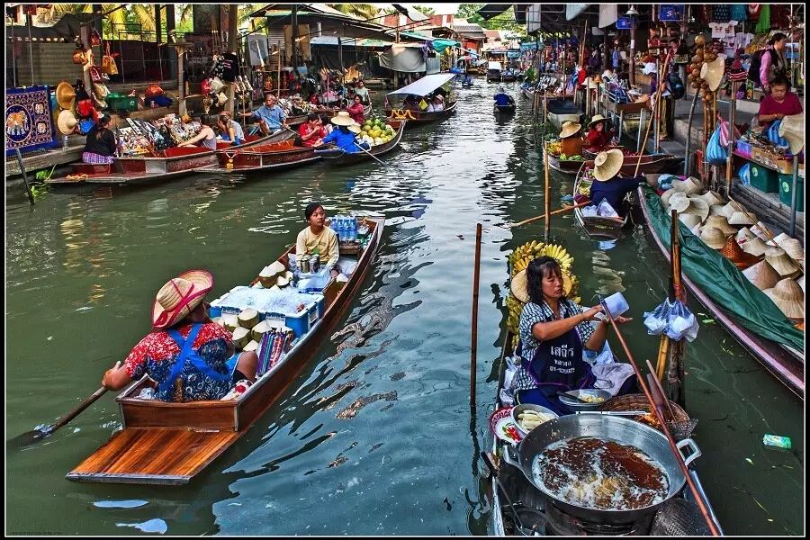 丹嫩沙多水上集市位于曼谷市西南,距离市内约80公里。 这是至今唯一依然保持着泰国昔日水上集市风貌的集市。 集市中,一条条卖货的小船在运河上交错往来,再加上河岸边那一家家水乡居民的住宅,构成了一幅令人深感亲切而又典型的曼谷印象图卷。
