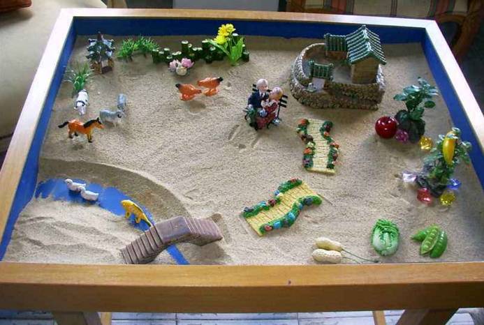 治疗在一个自由却受保护的空间——沙盘治疗室中进行,来访者从玩具架上自由挑选玩具,在盛有细沙的沙盘里进行自我表现的一种“游戏”。沙盘游戏设备的构成包括:沙盘、沙子和沙具等必备的设备。