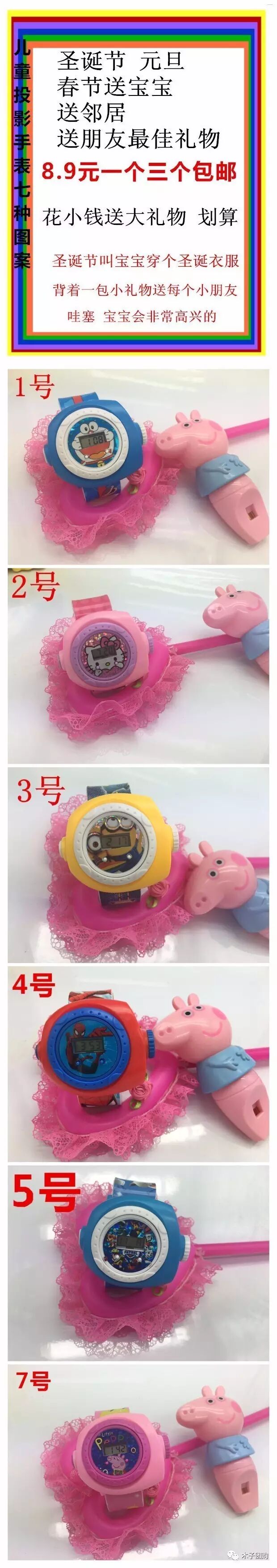 性价比不能更高的小玩具一枚,7个图案,小朋友们最爱的全明星啊,hello kitty、小猪佩奇、哆啦A梦、ME2,超级飞侠......带有投影功能,按下侧边的投影按钮,另一边的投影口就会显出各种卡通形象来,旋转投影口还能调节清晰度,每个都可以投出不同的20张图片。投射的光源很柔和不刺眼。做工也是很不错的,无毒无异味,作为哄孩子的小玩意性价比还是很高滴,满足下想要个手表的小朋友。在还没有掌握正确的看表方法的时候,这个可以作为有趣的入门级小手表,又是一个好玩的小玩具,有助于孩子们养成时间观念。都是独立包装,过年分送给家里的小朋友们很不错哦~