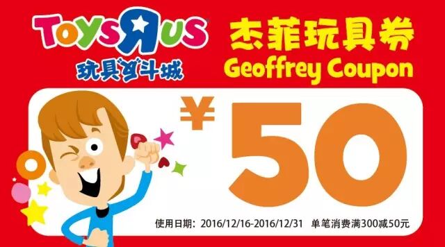 注意事项:此券不可兑换现金或与其它优惠券同时使用;单笔消费满300元或以上方可使用。仅限在玩具“反”斗城线下西安地区门店使用。使用时间:2016.12.16 — 2016.12.31。