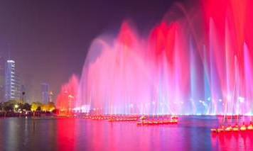 红谷滩秋水广场上音乐灯光喷泉引人注目,是亚洲最大的音乐喷泉群,喷水池面积1.2万平方米,主喷高度达128米,是南昌市一靓丽景观。人们可一边欣赏音乐一边观看滕王阁美景。