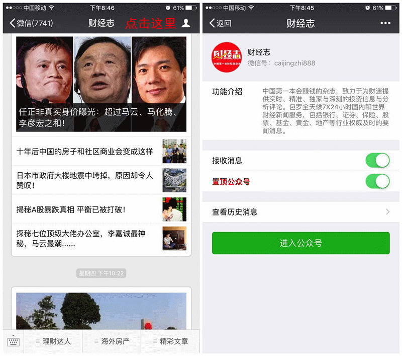 财经志教你一招,轻松两步骤,就可以在第一时间得到优质的阅读内容:首先,将微信升级到最新版本;其次,将财经志(微信公号:caijingzhi888)置顶,就可以了!