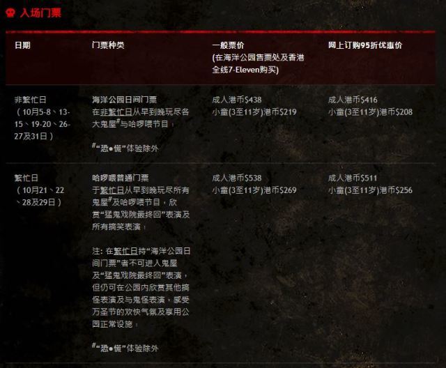非繁忙日的香港海洋公园日间门票,成人只需HK$438,儿童票只需HK$219;繁忙日哈啰喂普通门票,成人HK$538,儿童只需HK$269。选购哈啰喂优越门票者,还可享受独家万圣节优惠礼遇!
