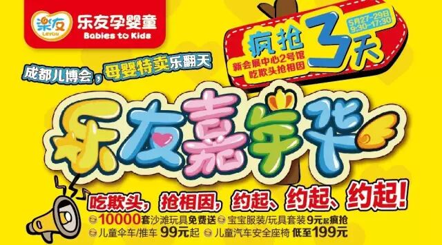 乐友嘉年华&儿博会5月27~29号,在新会展中心近万平米的2号馆华丽丽的即将开始啦!宝宝服装低至9元起哦!还有雅培、惠氏、美赞臣、美素佳儿、雀巢、合生元、英氏、澳优、伊利.....等等知名大牌奶粉和好奇、舒比奇、伊瑞丝、凯瑞斯......等等知名大牌尿裤 ,价格统统击穿你的想象,更有大堆的精美赠品买就送哦!![]()