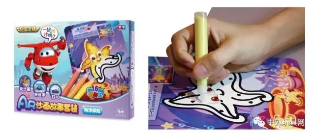 每款13张沙画卡+16色彩沙+1个彩砂收纳盘+1把软毛刷,涂色区域有AR识别功能,13张沙画卡=超级飞侠海洋冒险故事。