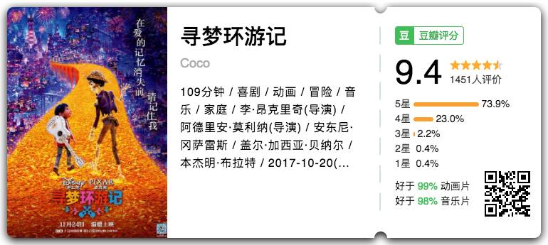 年度最佳动画片来啦!迪士尼·皮克斯出品高分动画《寻梦环游记》11月24日在中国内地上映!影片是皮克斯动画工作室的第19部长片,也是皮克斯首部音乐题材电影,更是《玩具总动员》系列金牌团队推出的又一诚意之作。
