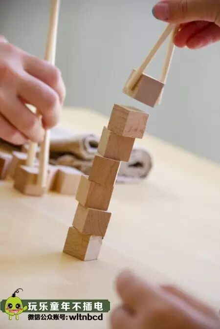 用筷子夹住小木块一个一个叠起来,看谁叠的最高!