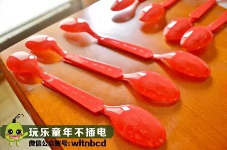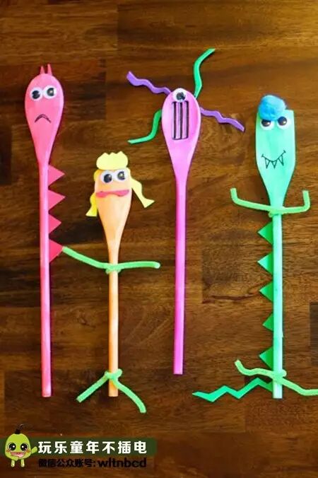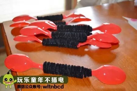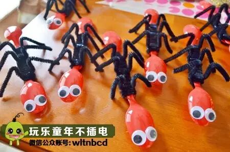 把两个一次性勺子的把手叠在一起,用毛根绑起来,再用毛根做几条腿,贴上活动眼睛就完成了,快来组建你的蚂蚁部队吧!