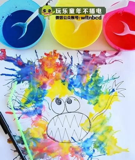 先在纸上画出一个造型,然后就可以滴上颜色水开始用吸管吹了,很自然吹成什么样子都可以哦!