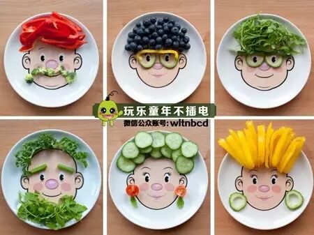 用一个这样带有人脸图案的盘子,在上面摆上各种蔬菜、水果切成的造型来做装饰,你能做出多少种造型呢!