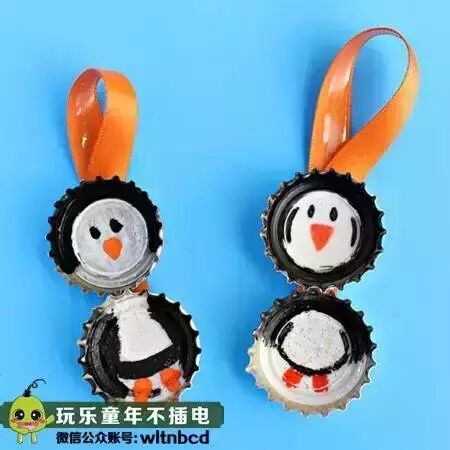 首先要用一个丝带将两个瓶盖连在一起,然后在用彩笔在瓶盖里画上企鹅的模样,一只可爱的小企鹅就做好了哦!