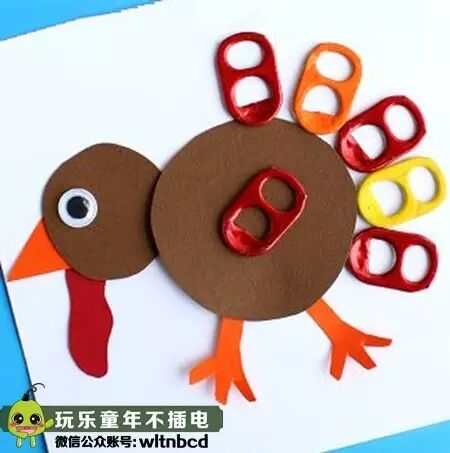 首先要用卡纸剪出两个一大一小的圆做小鸡的脑袋和身子,再剪出小鸡的嘴和脚,然后把它们都贴在另一张大的卡纸上,最后在贴好的小鸡脑袋上贴上活动眼睛,在身子上贴一个易拉环做翅膀,在身子的右上方沿着身子贴半圈易拉环做尾巴,一只彩色的小鸡就做好了!