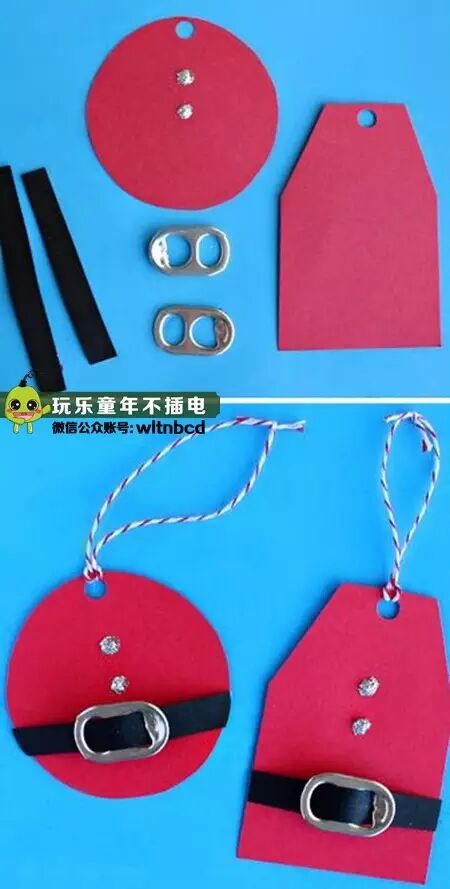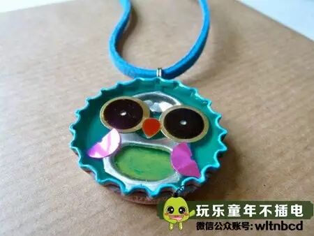 在一个瓶盖里粘上一个易拉环做嘴,再粘上眼睛、鼻子和红脸蛋,穿上一根线绳就可以挂在胸前啦!