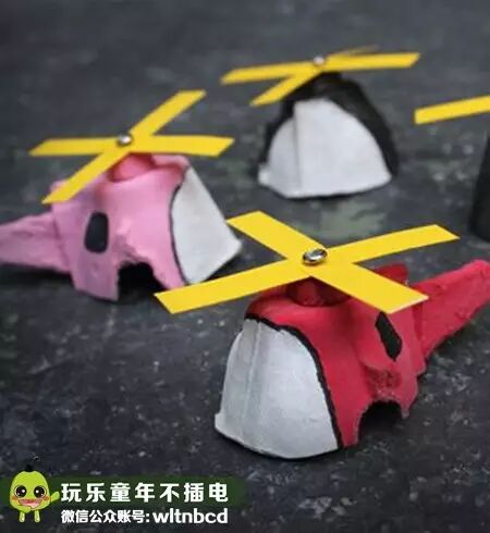 首先要把鸡蛋托剪开成直升机的形状,涂上颜色,再用卡纸剪两个长条,将这两个长条十字交叉用两脚钉固定在顶部。准备起飞啦!