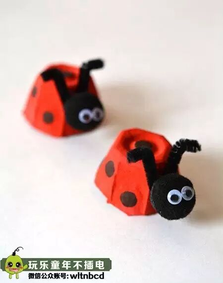 把鸡蛋托剪下来,在涂上颜色画上圆点,再在前面粘上一个毛球做脑袋、两根毛根做触角,最后贴上两根活动眼睛就完成啦!
