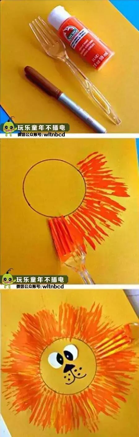 用叉子沾上颜料,在纸上画出不同的造型。比如这只狮子,先在纸上画一个圆,在画上五官,最后用叉子沾上颜料在圆的周围印上一圈,一只可爱的小狮子就诞生啦!