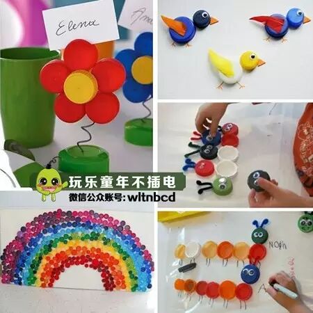 这次用的是塑料瓶盖哦!可以粘出一朵花,也可以加上装饰粘成一只小鸟,还可以用很多瓶盖粘成一只毛毛虫哦!总之你的花园你说了算!