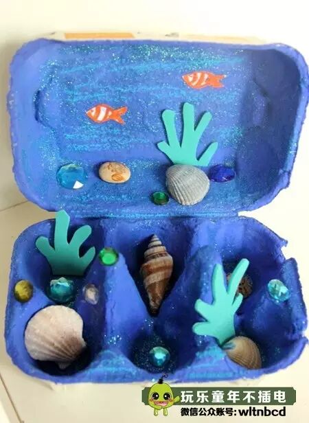 把现成的鸡蛋盒染成蓝色,用卡纸或者海绵纸剪出珊瑚的形状做装饰,还可以剪一些小鱼、找来真的贝壳和海螺做装饰,一个收纳盒就做好了!