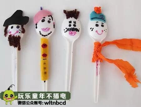 用无纺布剪成衣服和帽子的形状粘在勺子上,在用彩笔画上五官,用线绳粘上头发和胡须,变白造型你做主!