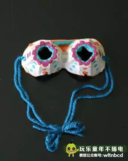 把鸡蛋托剪成两个连在一起的形状,再涂上颜色画上装饰,然后在鸡蛋托的顶部划开一个十字口向里折下去,最后在两侧打两个洞,穿上线绳就可以戴啦!