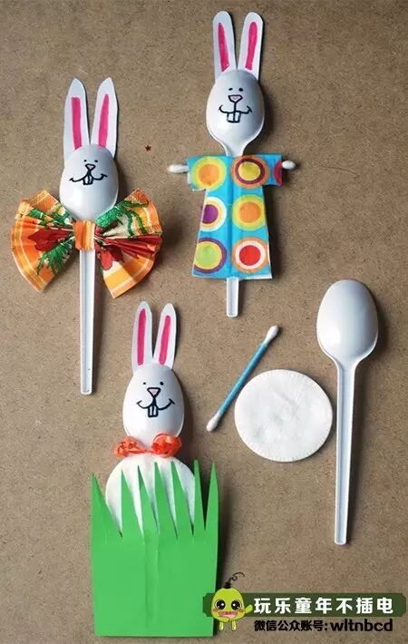 用卡纸剪成衣服、小草或者折成蝴蝶结粘在勺子把手上,在剪个兔耳朵粘在勺子上,最后用彩笔画上兔子的五官就完成了!