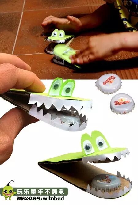 用瓦楞纸剪成长条形,从中间对折。然后把两个瓶盖用胶水黏在瓦楞纸上面,再用橡皮筋将其固定,知道胶水干了为止。把瓦楞纸的边缘沿着瓶盖剪成半圆形,再找来彩色卡纸剪成一样的形状粘在外侧,最后用彩色卡纸做好眼睛和牙齿粘在上面就完成了。