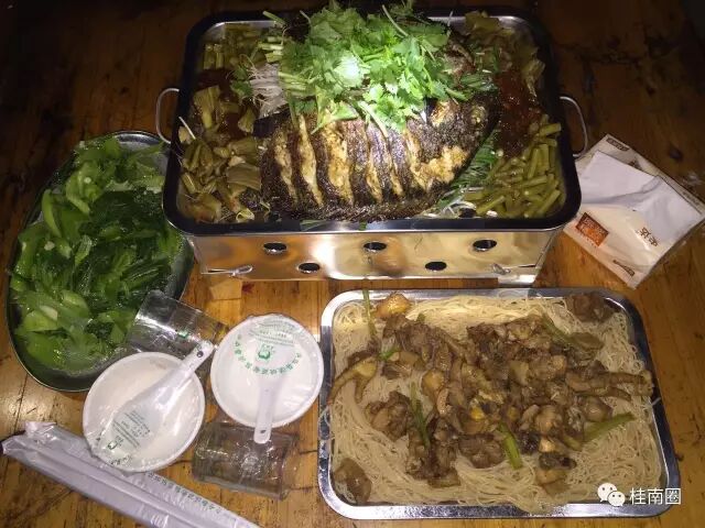 套餐二:门票6张90元,烤鱼45元,鸡肉米粉58元,青菜一份15元,米饭一股10元,餐具6元,优惠价168元