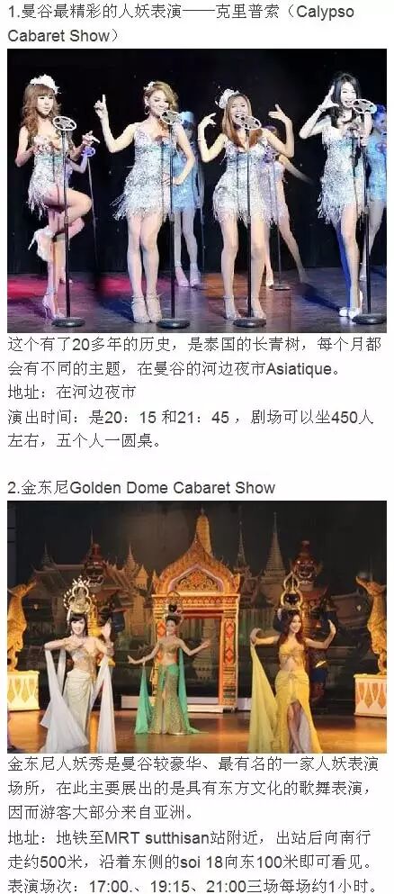 人妖秀并不像你想象得那么色情,而是一场艳丽的艺术表演,它的服装、道具、灯光都非常华丽,表演也非常专业到位,颇具艺术气息。大约1/3的节目含有中国元素,堪比缩小版春晚(1个多小时)。价格也很便宜,表演结束后记得跟美艳的人妖合照哟!嘿嘿