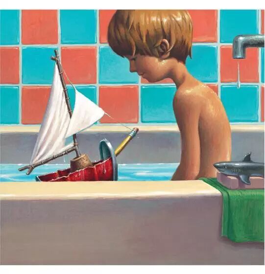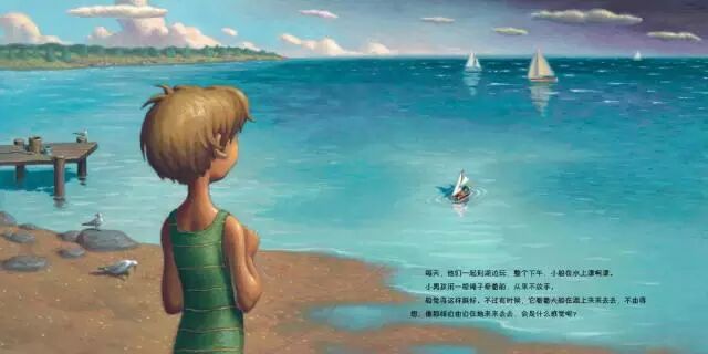 每天,他们一起到湖边玩,整个下午,小船在水上漂呀漂。小男孩用一根绳子牵着船,从来不放手。
