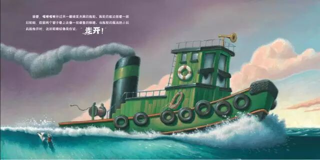接着,嘎嚓嘎嚓开过来一艘绿里夹黑的拖轮。拖轮的舷边挂着一排旧轮船,前面两个窗子看上去像一双疲惫的眼睛。当拖轮的尾流把小玩具船推开的时候,这双眼睛好像是在说:“走开!”