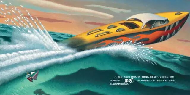 不一会儿,后面又飞快地开来一艘快艇。艇身扁平,尖利闪光,它的马达在尖叫:“走开!”然后呼呼地开了过去,带起一股风,吹得小玩具船的帆簌簌抖动。