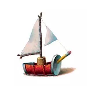 有一个小男孩,用一个罐头瓶、一个软木塞、一支黄铅笔和一些白布,做了一支玩具船。
