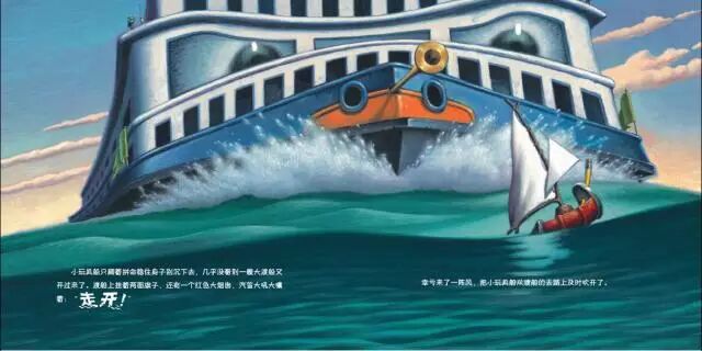 小玩具船只顾着拼命稳住身子别沉下去,几乎没看到一艘大渡船又开了过来。渡船上挂着两面旗子,还有一个红色大烟囱,汽笛大吼大嚷着:“走开!”