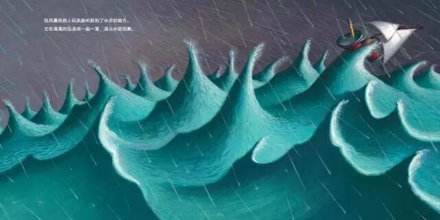 有一天下午,湖上刮起了风掀起了浪,乌云笼罩着整个湖面。小男孩的妈妈赶来,把小男孩拉回了家。由于她拉得太急,小男孩手里的绳子掉了下去。