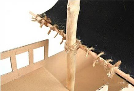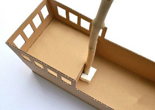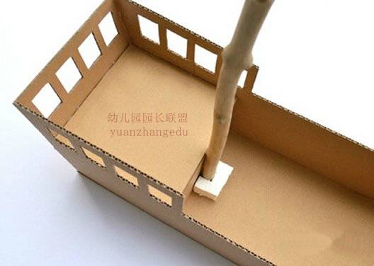 用瓦楞纸制作船舱,同时用泡沫板固定船杆