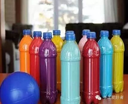 所需材料:矿泉水瓶若干,颜料,皮球(可以在矿泉水瓶内注入一些水,让它们立着更稳)。